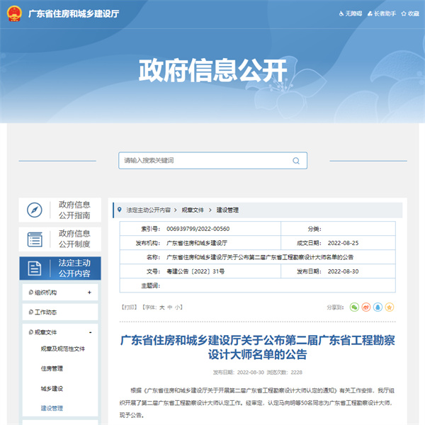 2022年8月30日,廣東省住房和城鄉(xiāng)建設(shè)廳網(wǎng)站發(fā)布第二屆廣東省工程勘察設(shè)計大師評選結(jié)果,公司總工程師徐波、首席專家靳守杰、特聘專家王建新榜上有名,獲評廣東省工程勘察設(shè)計大師。同時獲評3位廣東省工程勘察設(shè)計大師,體現(xiàn)了公司在尖端科技人才培養(yǎng)、專家團(tuán)隊建設(shè)的發(fā)展優(yōu)勢,標(biāo)志著公司在人才工程建設(shè)方面取得了階段性勝利,為企業(yè)技術(shù)創(chuàng)新、成果轉(zhuǎn)化、人才培養(yǎng)等方面提供了更廣闊的發(fā)展空間。