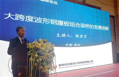 陳宜言董事長在大會上做了題為《大跨度波形鋼腹板組合梁橋的發展創新》的主題演講。他首先介紹了中國橋梁建設已由橋梁大國向強國發展中所取得的成就,梳理了中國橋梁發展的脈絡,還介紹了大跨度波形鋼腹板組合橋這一新型組合橋梁的特點和發展歷史,并詳細介紹我司對該類橋梁的設計和創新工作。他還指出,深圳市東寶河新安特大橋的結構創新設計,證明了我國大跨度波形鋼腹板組合箱梁橋的跨徑已經取得巨大突破,當前的設計和施工技術水平可以使該橋梁的主跨達到200m。伊朗德黑蘭北部高速BR-06特大橋的成功合龍,體現了大跨度波形鋼腹板組合箱梁橋在強地震烈度地區的推廣和使用價值。而在建中的合肥市南淝河特大橋,進一步說明了波形鋼腹板組合箱梁橋可以滿足超寬城市橋梁的設計要求。該橋也是我國首次將耐候鋼大規模使用到大跨度波形鋼腹板組合箱梁橋上,為我國鋼混組合結構橋梁的防腐和養護提出了新的解決方案。他認為“中國制造2025”概念的提出,為我國由橋梁大國轉變成橋梁強國帶來了最佳契機。雖然我國橋梁工程設計、施工和科研方面都取得了一定成果,但仍需要持續提升我國橋梁建設創新能力和技術競爭力,尤其在結構分析和設計軟件國產化方面需下大力氣。大跨度波形鋼腹板組合梁橋,比起預應力混凝土梁橋具有顯著的社會和經濟效益,將在建設橋梁強國的過程中發揮重要作用。近十年來陳宜言董事長對推動我國大跨度波形鋼腹板組合箱梁發展所做出的貢獻,得到了與會專家學者的贊賞,他對中國橋梁工程發展創新的觀點也得到大家認同。