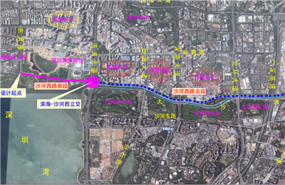沙河西路位于深圳市南山區(qū),起點(diǎn)位于東濱路,終點(diǎn)至茶光路口,全長(zhǎng)約7.43公里。按城市快速路標(biāo)準(zhǔn)建設(shè),主線雙向6車道,主線設(shè)計(jì)車速60km/h,濱海-沙河西立交部分匝道設(shè)計(jì)車速50km/h,其余輔道及匝道設(shè)計(jì)車速30公里/小時(shí)。改造內(nèi)容包括:主車道和兩側(cè)輔道路面加鋪瀝青混凝土,完善全線輔道系統(tǒng)、主輔出入口及立交節(jié)點(diǎn)的改造優(yōu)化,新建人行過(guò)街天橋6座,延長(zhǎng)現(xiàn)狀天橋1座,新增港灣式公交站6對(duì),重新鋪設(shè)人行道板磚,更換現(xiàn)狀混凝土立道牙、完善交通及交通監(jiān)控設(shè)施以及完善相關(guān)市政管線設(shè)施等。