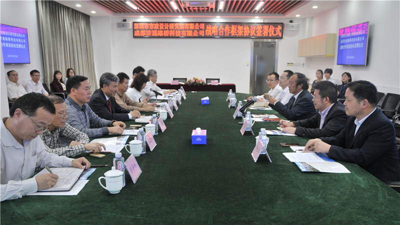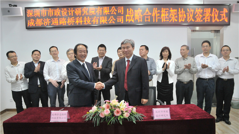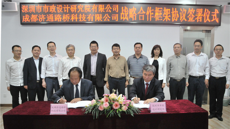 2017年4月24日下午,我公司與成都濟通路橋科技有限公司(以下簡稱“濟通科技”)戰略合作框架簽署儀式在公司一樓技術交流中心舉行,董事長陳宜言設計大師和濟通科技伍廷貴董事長代表雙方簽字。蔡明總經理、宋榮亮主席、郭明副書記、王建新副總經理、張健君副總經理、許華林副總經理、徐波總工程師以及相關部門負責人和專業總工,濟通科技伍大成總經理、趙鵬賢副總經理,鄒貽軍技術總監、技術部高建主任出席簽署儀式。儀式由我公司黨委副書記、紀委書記、工會主席郭明主持。