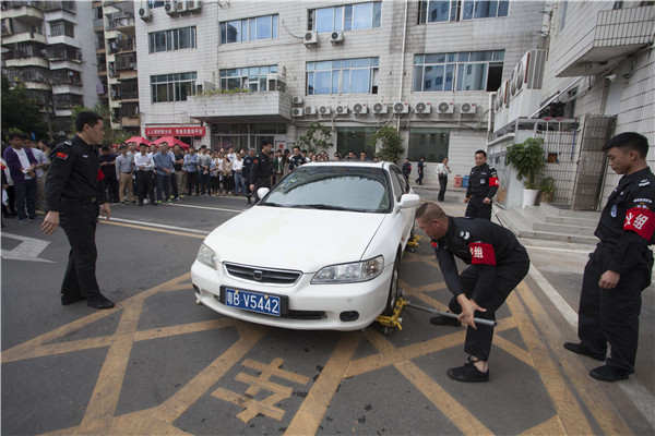 在緊張的滅火救援過程中,一名“恐怖分子”趁亂混進停車場,抽出長刀對車輛亂砸亂砍,引起了現場的騷亂。保安員立刻抽調人手攜帶防暴器械進行阻止。面對窮兇極惡的“恐怖分子”,平時訓練有素的保安員毫不畏懼,利用防暴盾、防暴鋼叉等器械對其進行壓制,經過一番周旋和搏斗后成功將其制服。