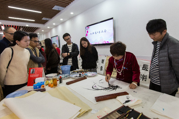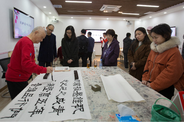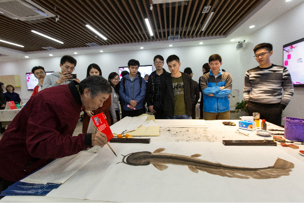 深漂藝術(shù)家魏治平老師在創(chuàng)作的間隙,為大家講述了書畫的精神內(nèi)涵以及在新時(shí)代下他對書畫的理解,生動(dòng)地將“青春踐行十九大”、“幸福都是奮斗出來的”、“逢山開路遇水架橋”等文字融入自己的書畫創(chuàng)作中,令在場的青年員工受益匪淺。