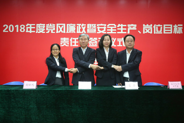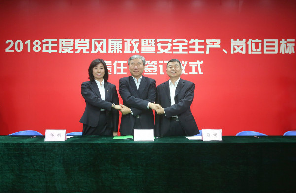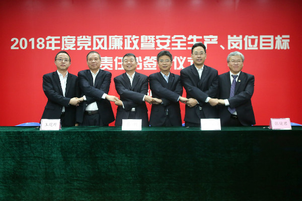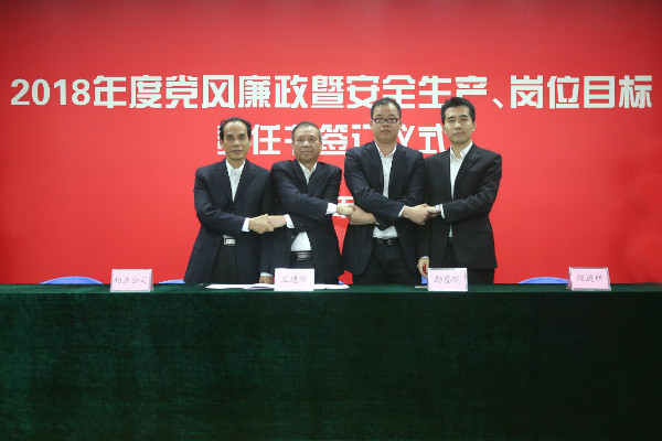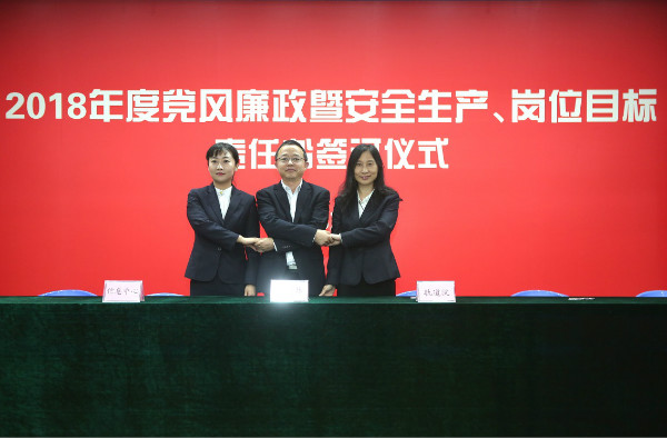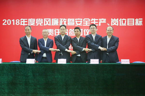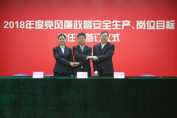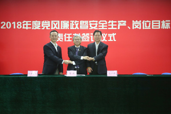 儀式開始,黨委書記、董事長陳宜言與黨委副書記、總經(jīng)理蔡明和黨委副書記、紀(jì)委書記、工會(huì)主席郭明簽署了《2018年度崗位目標(biāo)責(zé)任書》、《2018年度黨風(fēng)廉政責(zé)任書》及《2018年度安全生產(chǎn)責(zé)任書》。黨委副書記、總經(jīng)理蔡明與副總經(jīng)理歐陽宇峰、副總經(jīng)理王建新、副總經(jīng)理張健君、副總經(jīng)理許華林、總工程師徐波簽署責(zé)任書。緊接著,各分管領(lǐng)導(dǎo)與分管部門負(fù)責(zé)人簽署責(zé)任書。