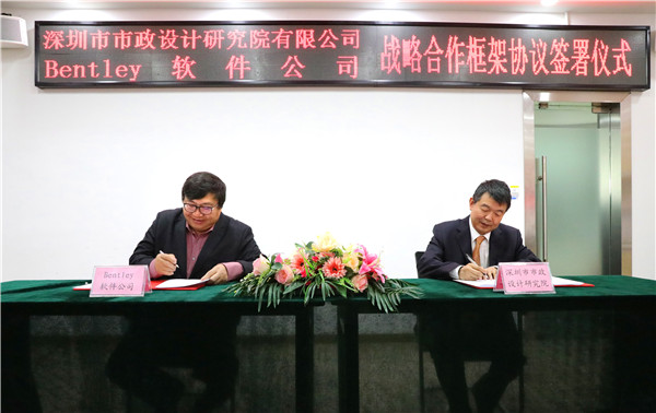 2018年4月24日上午,公司與BENTLEY軟件(北京)有限公司(以下簡稱“BENTLEY公司”)戰略合作框架協議簽署儀式在市政設計大廈一樓技術交流中心舉行。公司總經理蔡明、副總經理許華林以及相關部門負責人,BENTLEY公司北亞區總裁劉德盛、技術總監李翔等領導與嘉賓參加了簽署儀式。公司總經理蔡明與BENTLEY公司北亞區總裁劉德盛分別代表雙方在戰略合作框架協議上簽字。