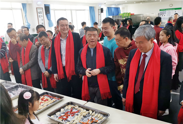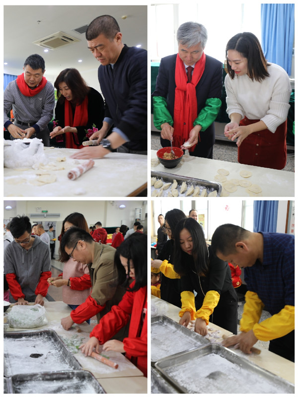 伴隨著喜慶的音樂,各位領導來到了包餃子活動的現場。辛杰率先拿起面團,以熟練的手藝搟起餃子皮,其余領導也加入到包餃子的行列,大家齊心協力,分秒間一個個餃子以精致的造型展現在大家面前。