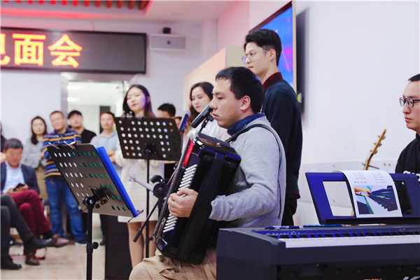 演出現場,樂團成員通過豐富的互動游戲、詼諧的串場、形式種類多樣的音樂表演給同事們帶來了一場視聽盛宴。開場一首歡快的樂器合奏《鈴兒響叮當》便點燃了觀眾的熱情;節奏感和感染性極強樂器三連奏《The Game Is On》《Star Sky》《He's A Pirate》將演出的氣氛推向高潮;《成都》《小幸運》《曾經的你》《天黑黑》《貝加爾湖畔》等不同形式的曲目表演讓現場觀眾樂享其中。特邀嘉賓Yakup老師的精彩演出使得現場氣氛熱烈異常;最后,樂團組織現場觀眾即興合唱《遇見》《后來》,現場的歌聲記錄了同事們為音樂而感動的瞬間。